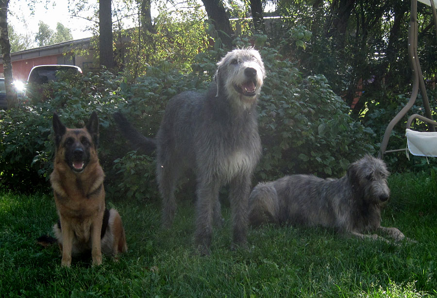 Leikkaan villiintynyttä pensasaitaa ja siistin pihan reunoja haravoimalla. Tytöt pitävät seuraa kukin omalla tavallaan: Blanka ja Romy painivat, kun taas Klaara valvoo ylimmäisenä yhtä hyvin painijat kuin aidantrimmaajankin.