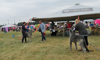 Today we were in Rusko and took part in Finnish Sighthound Club's Specialty. Irish wolfhounds were judged by Joachim Bartusch from Germany. Both girls got excellent with nice critics. Tiuku was EX/2 in open class and Blanka EX/4 CQ in champion class. Both girls behaved themselves nicely, but Tiuku was in a hurry to go back to Blanka.