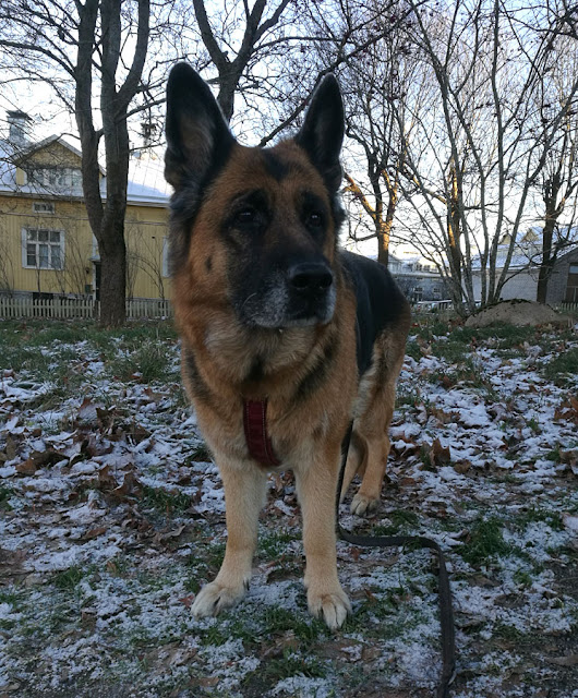 Yöllä tuli lunta, ja siitäkös kaikki tytöt innostuivat. Mummokoira sai kyllä takin päälle pakkasasteiden vuoksi, mutta nuorempia ei viluta.