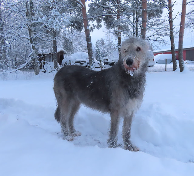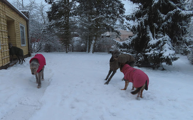 Joulupäivänä harmaata maisemaa eli lunta sateli lisää pitkin päivää. Tytöt nauttivat lumesta tiettyyn rajaan asti, mutta välillä pitää päästä sulattelemaan tassuja. Kaikki saivat takit ylleen, kun lumi jäi ikävästi irlantilaisten selkiin kiinni. Näissä kuvissa tytöt ovat hieman pysähdyksissä eli kytätään naapuripihalle, ja sain muutaman kuvan napattua.