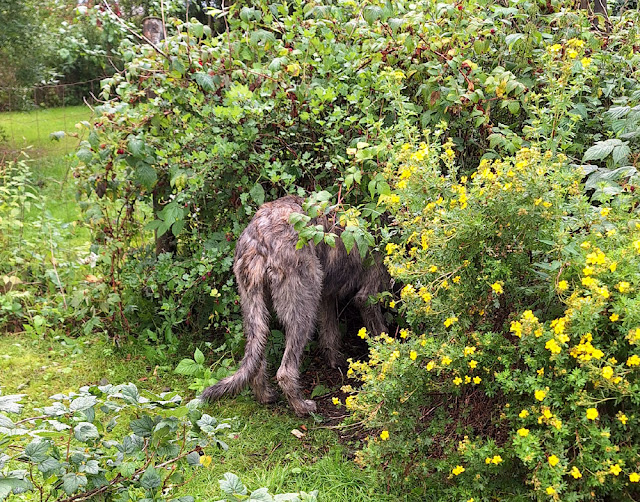 Marjat ovat jo kypsyneet ja omenat ovat kypsymässä. Lotta ylettyy takajaloille noustessaan itsekin omenapuusta nappaamaan raakileita, mutta kyllä niitä Papulle ja Turiellellekin tippuu. Yllä Papu syö (salaa) omenaa etupihan kulmassa. Alla Lotta ja Turielle hamuilemassa karviaisia ja vattuja.