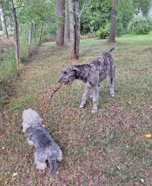 Papu ja Turielle leikkivät keppien kanssa, Lotta seuraa.